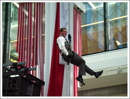 One of the first things I noticed as we found seats in the winter garden was two individuals strung up on ropes and sitting on swings high above the festivities. B thought they might be photographers, but they were dressed in what appeared to be some sort of costume.